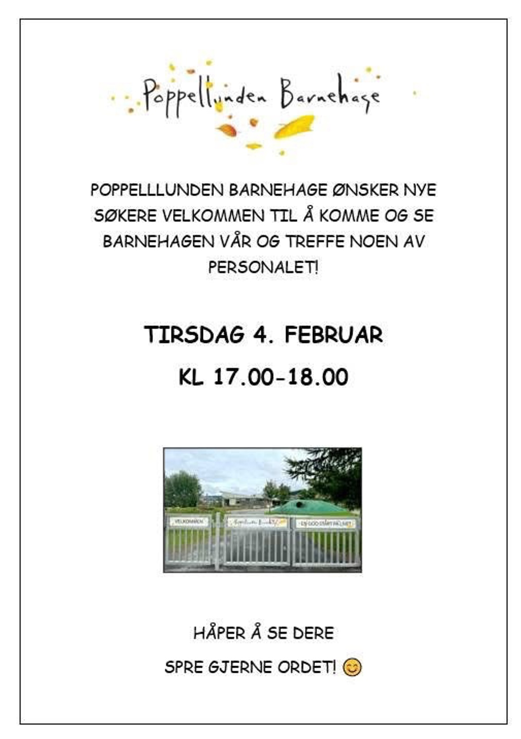 Skal ditt barn begynne i barnehage til høsten? Poppellunden barnehage inviterer dere på besøk 4. februar fra kl 17.00-18.00. Det vil bi muligheter til å stille spørsmål og ta en kikk rundt barnehagen både ute og inne. VI håper dere har lyst til å ta turen innom oss for en kaffekopp og en hyggelig prat! Velkommen skal dere være!